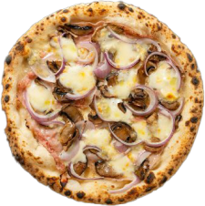 Cotto ham, roasted mushroom, gorgonzola, red onions, for di latte