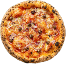 Tomato sauce, smoked provolone, spicy soppressata, red onion, black olives, chili flakes
